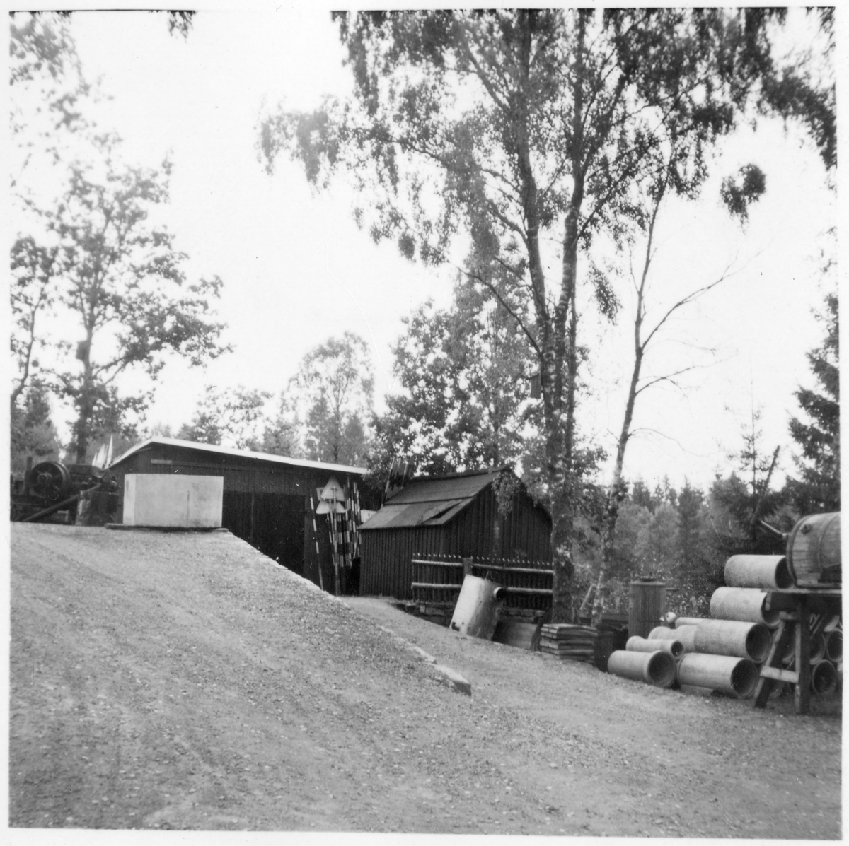 Vägstation G1, Markaryd. Materielupplag på gården. Öppet förråd (skjul) Vägmärken, delar till gengasaggregat, cementrör, muffrör.