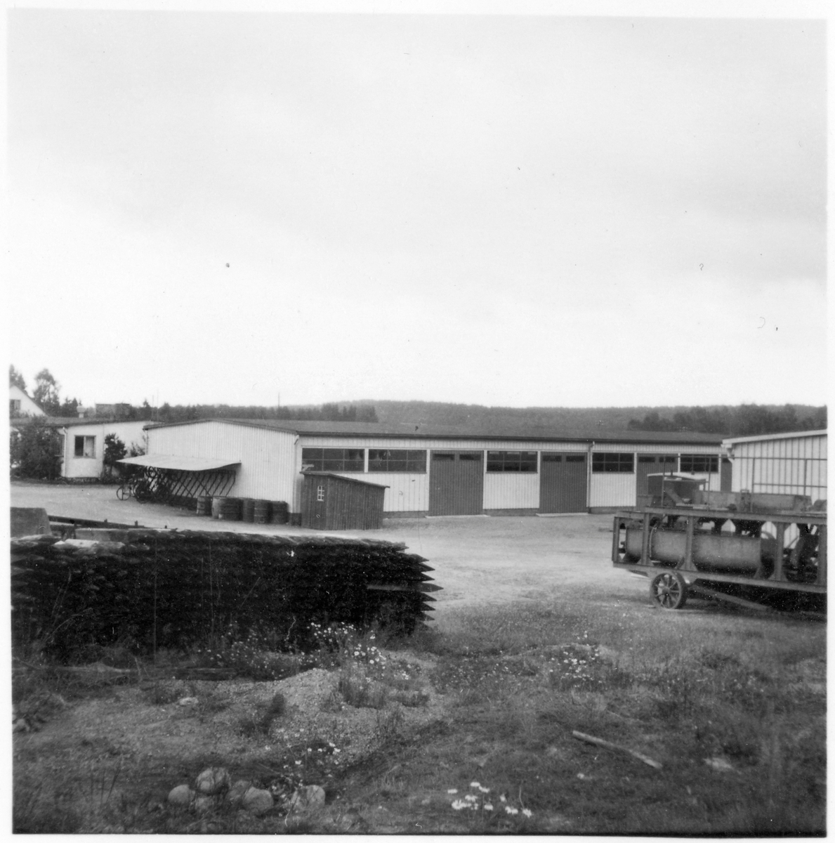 Vägstation G2, Berghem. Garagebyggnad. Vid gavel cykelställ med cyklar. Grussorteringsverk, hopfällt i transportläge.