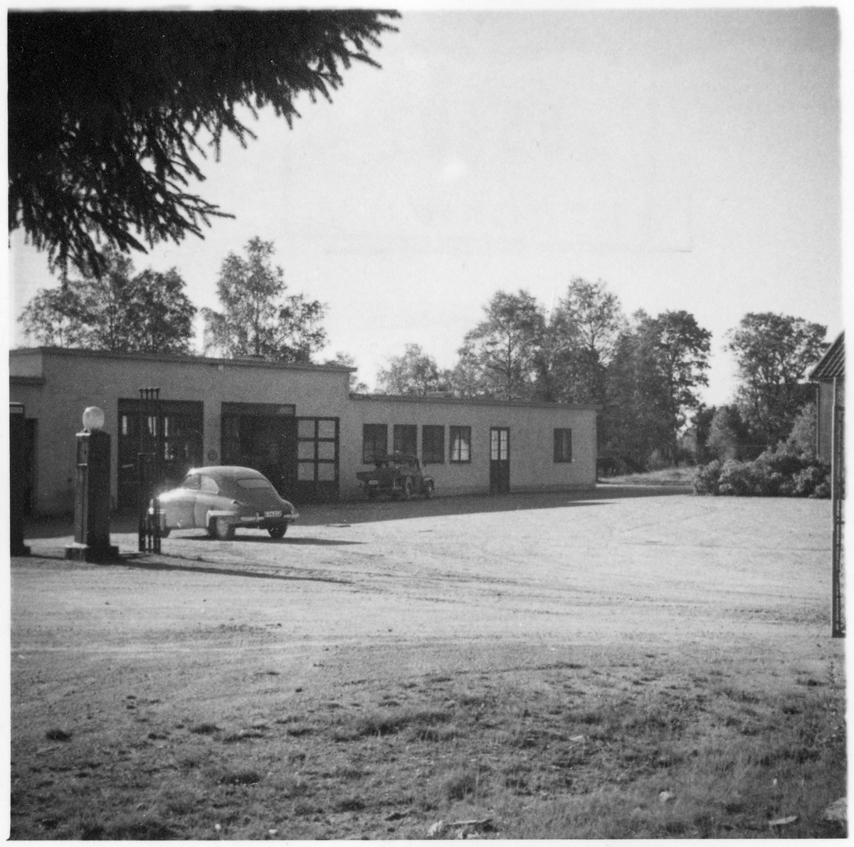 Vägstation G3, Vislanda. Stationsbyggnadens högra del med verkstad och kontor. Bensinpump (drivmedelspump) med personbil Saab, vid verkstaden liten lastbil (paketbil).