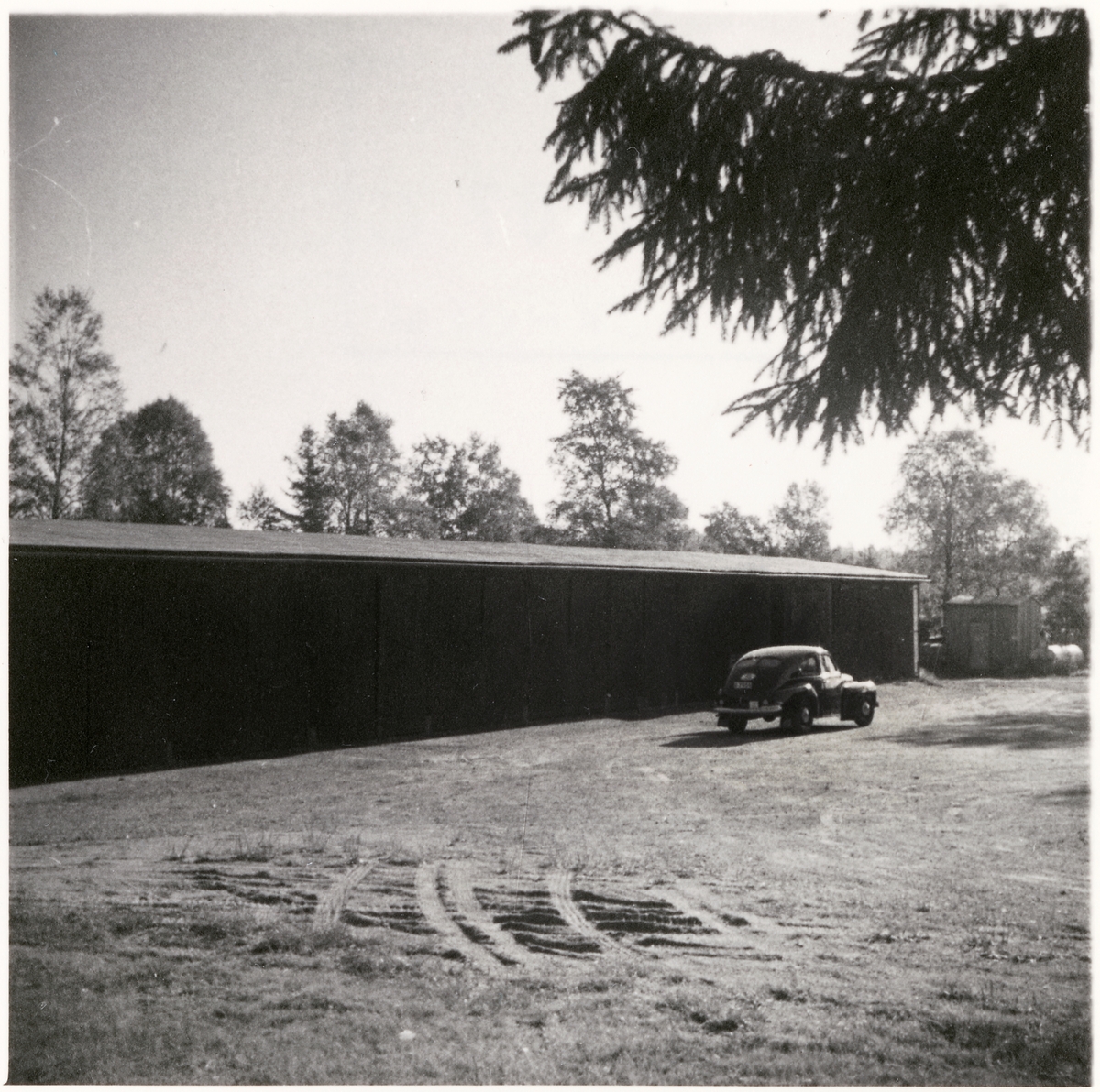 Vägstation G3, Vislanda. Förrådsbyggnad, personbil Volvo PV.