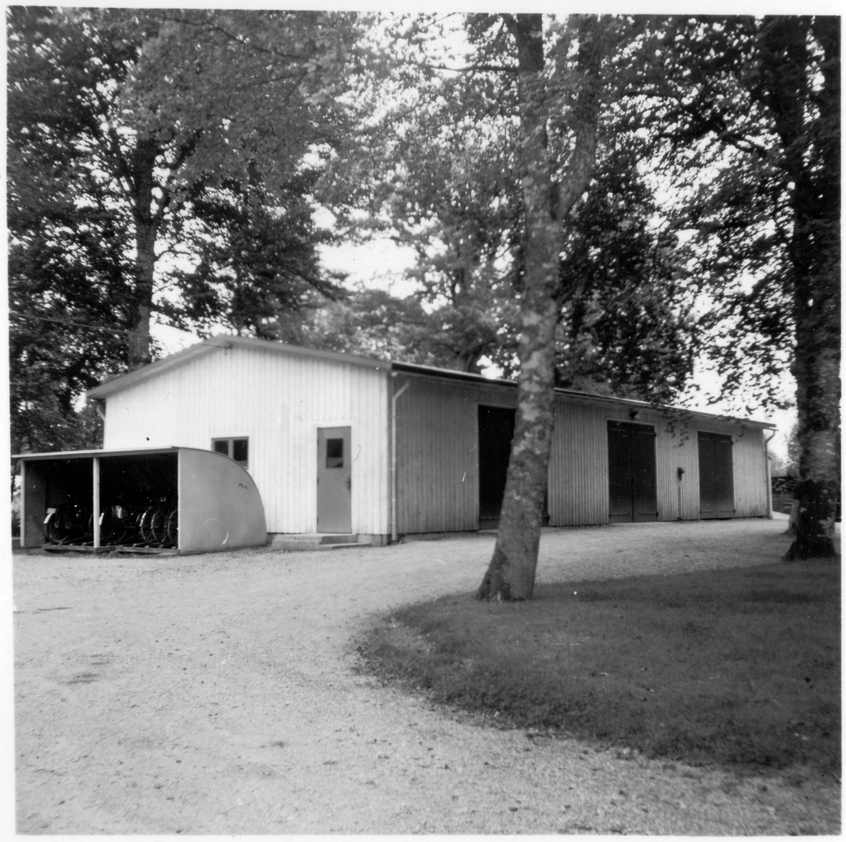 Vägstation G6, Älmeboda. Förrådsbyggnad. Cykelställ med cyklar vid gaveln.