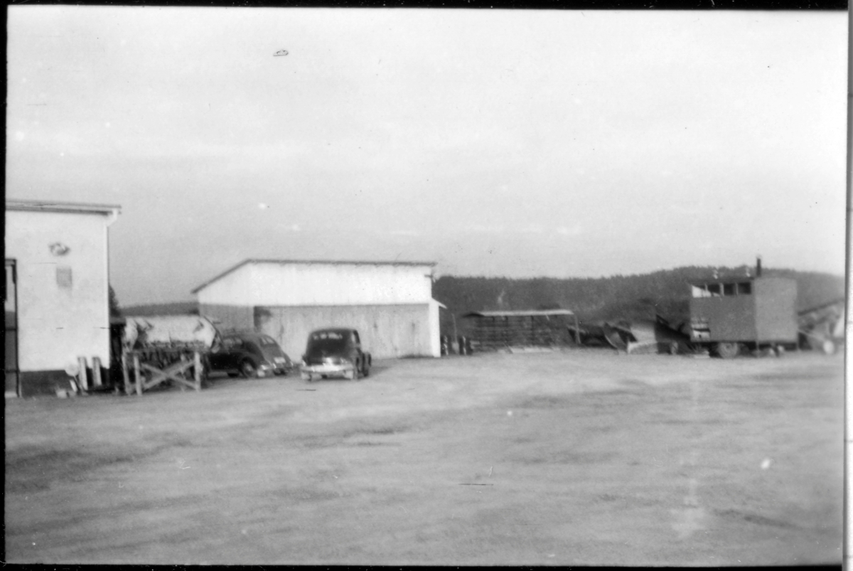 Vägstation P1, Hid. Vägstationens garageplan med förrådsbyggnader, manskapsvagn, spetsplogar och två personbilar, Volkswagen och Volvo PV