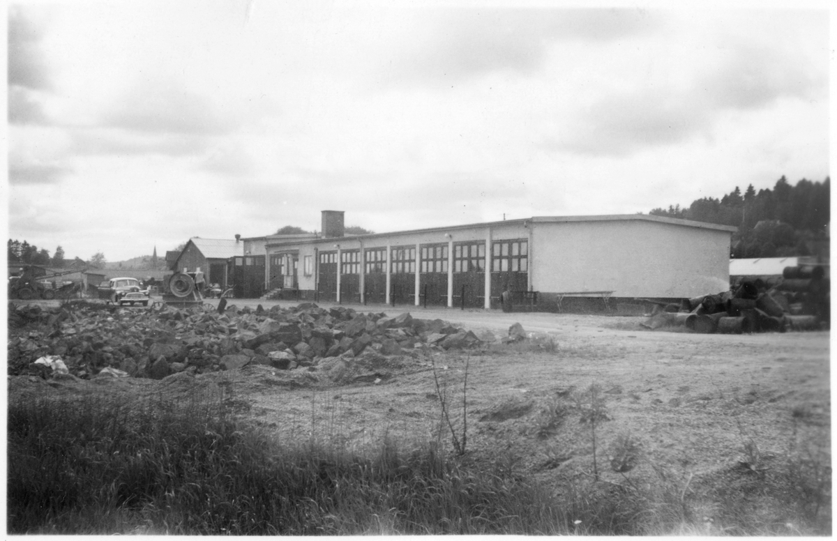 Vägstation P2, Kinna. Vägstationens huvudbyggnad med verkstad, kontor och garage. Förrådsbyggnad i bakgrunden. Personbil på garageplan. Garageplanen ej färdigplanerad, upplag av krossad sten.