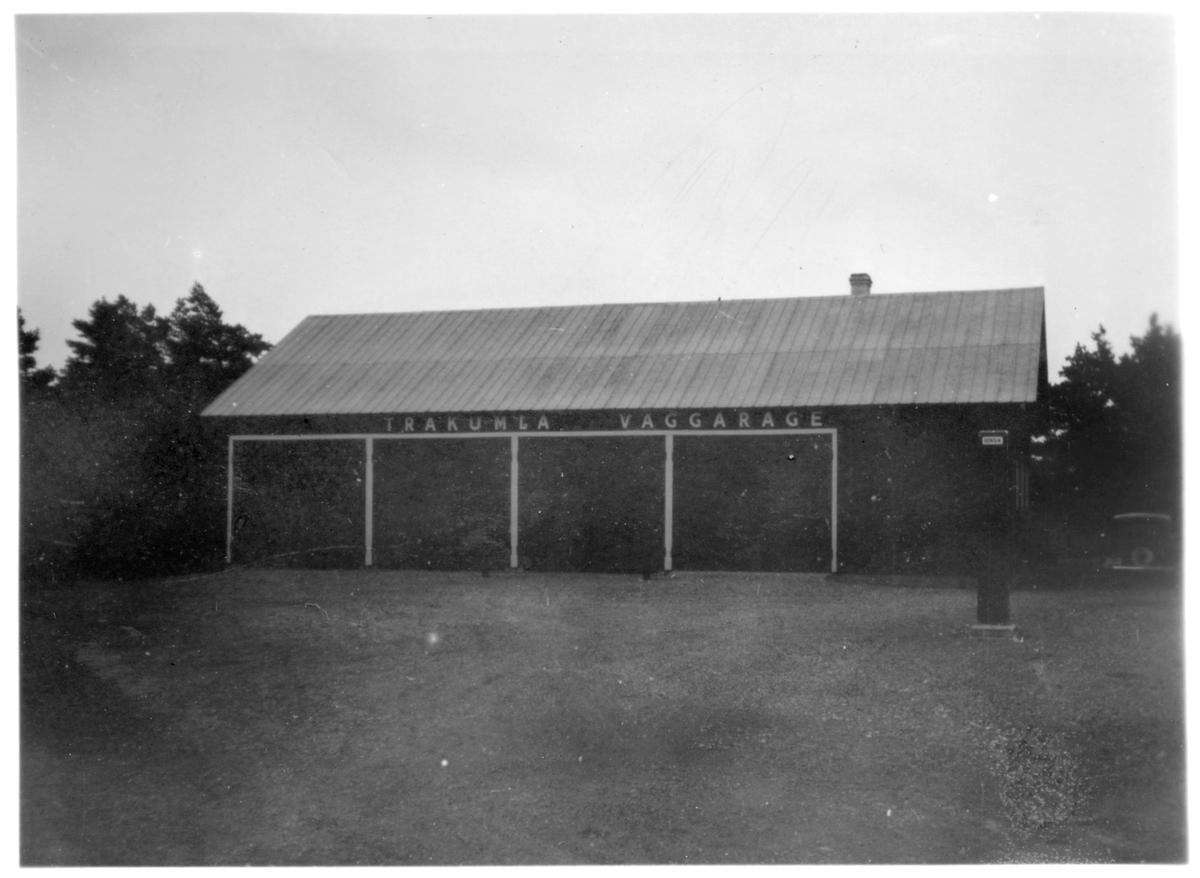 Vägstation I4, Klintehamn, filial Träkumla. Garagebyggnad. Mitt på väggen ovanför portarna skylt "Träkumla väggarage" i versaler. Bensinpump (drivmedelspump) till höger.