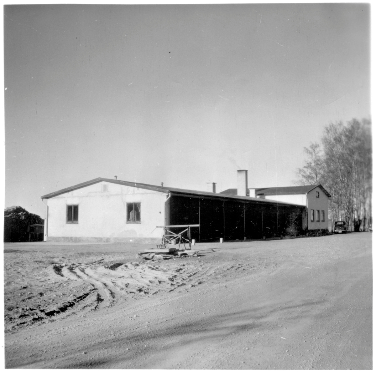 Vägstation R9, Lidköping. Vägstationens huvudbyggnad med garage och kontor. Tvärställd garagelänga. På garageplan vägsladd, personbil framför kontorsbyggnaden. Invid väg.