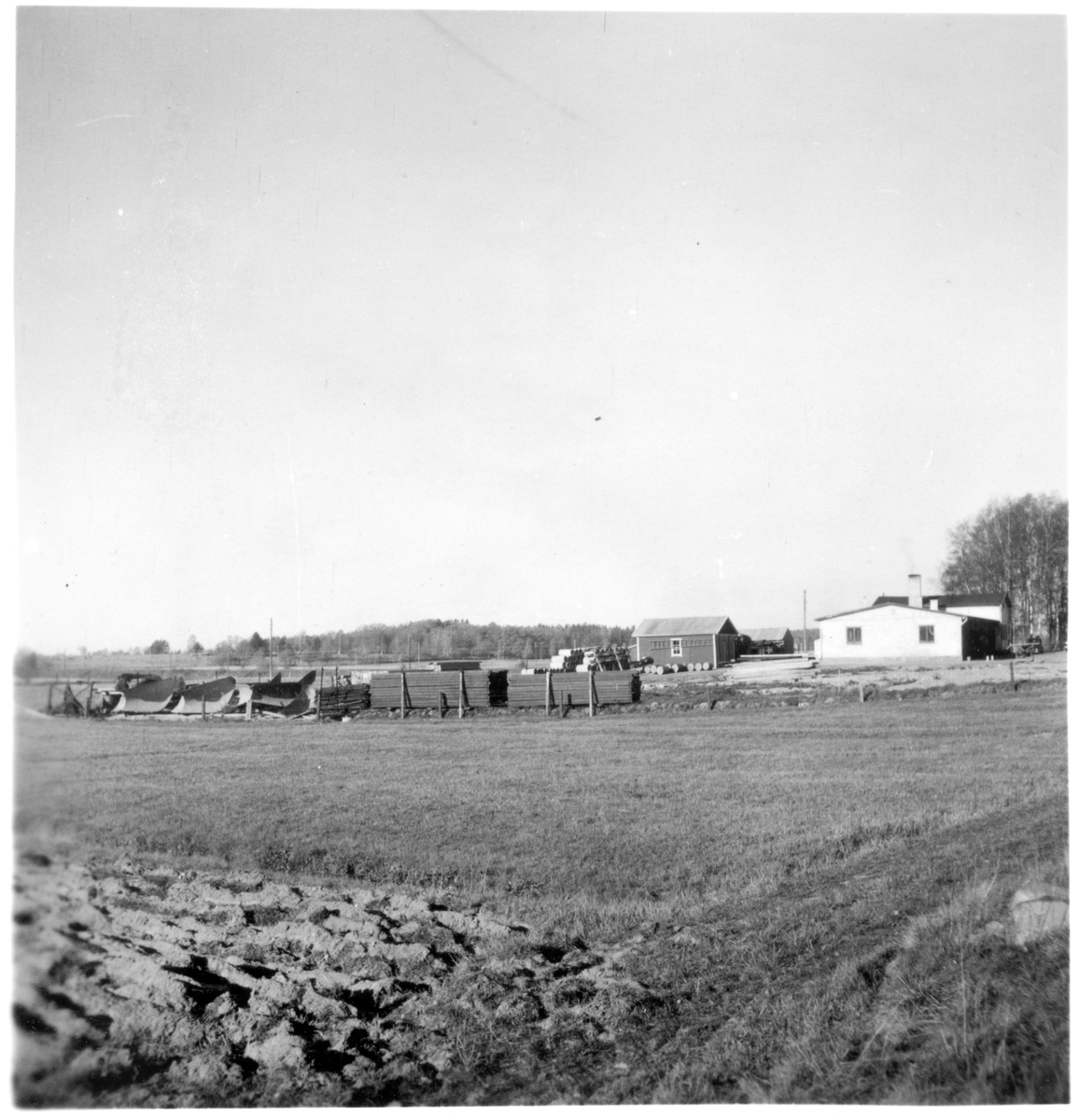 Vägstation R9, Lidköping. Vy mot vägstationen med garagebyggnaden närmast, förrådsbyggnad. Uppställda sidoplogar, spetsplogar, sandspridare.