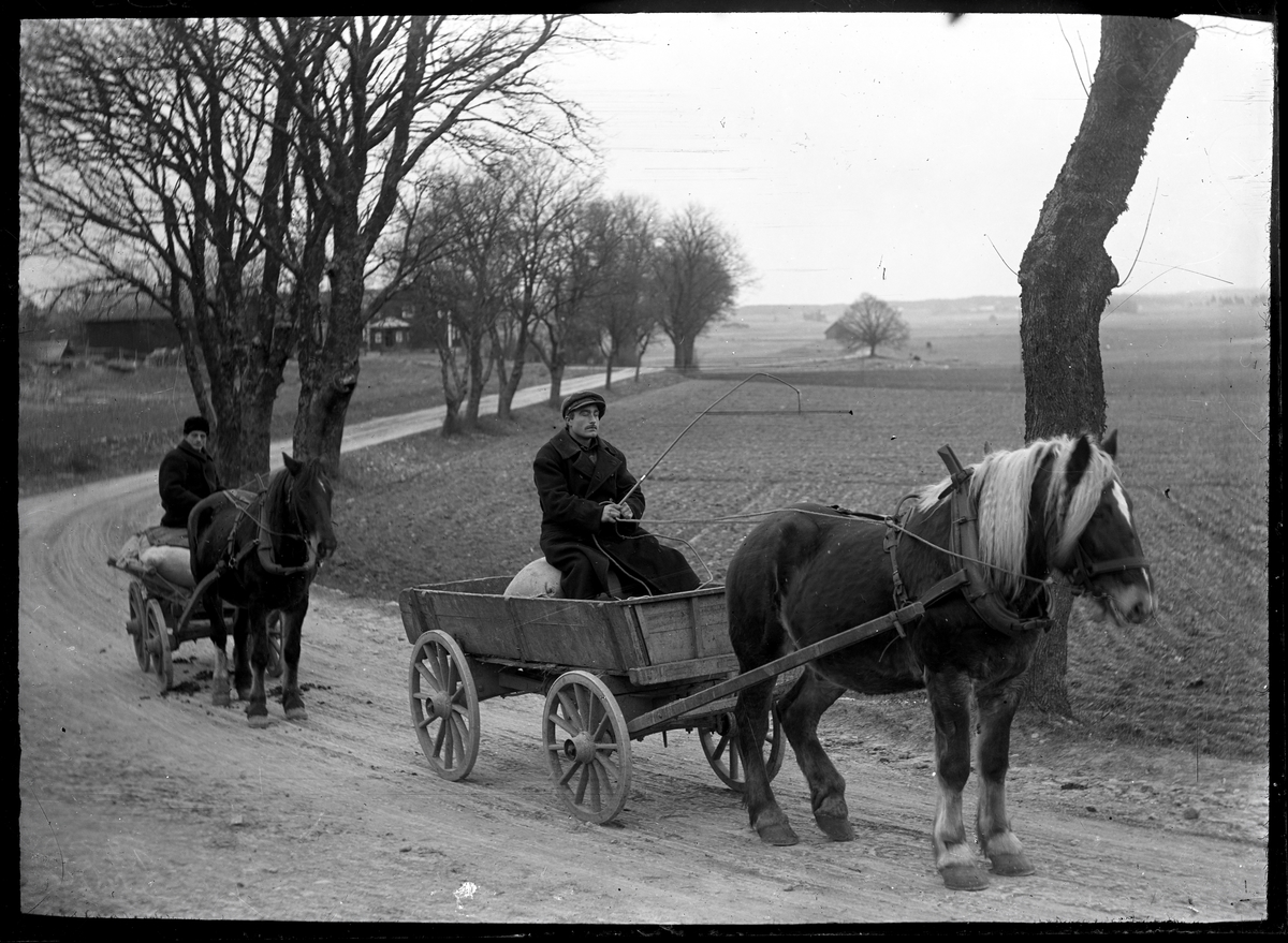 Två hästekipage passerar Prästgården i Fredsberg, sannolikt på väg till kvarnen då säckar skymtas på vagnarna.