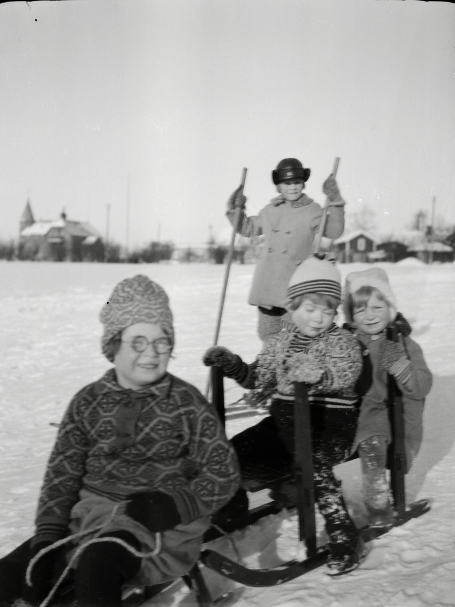 Barn med kälke och skidor