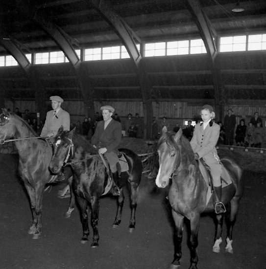 Ryttartävling i SKLS (Skaraborgs Läns Slakteriförening) uppvisningshall, Skara. 1/4 1951.