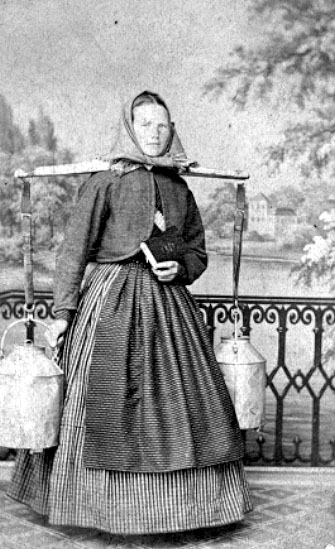 Anna Maja Linder från Lövängen hitom Åkerdal. "Var så gott som den första, som transporterade mjölk till Skara, bar varje dag till staden" enligt skomakaren P. A. Johansson som skänkt detta fotografi. Hon tog livet av sig.