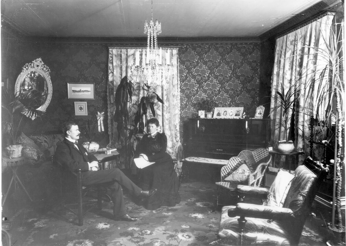 Interiör av hem i Härnösand, med piano och ungt herrskap.