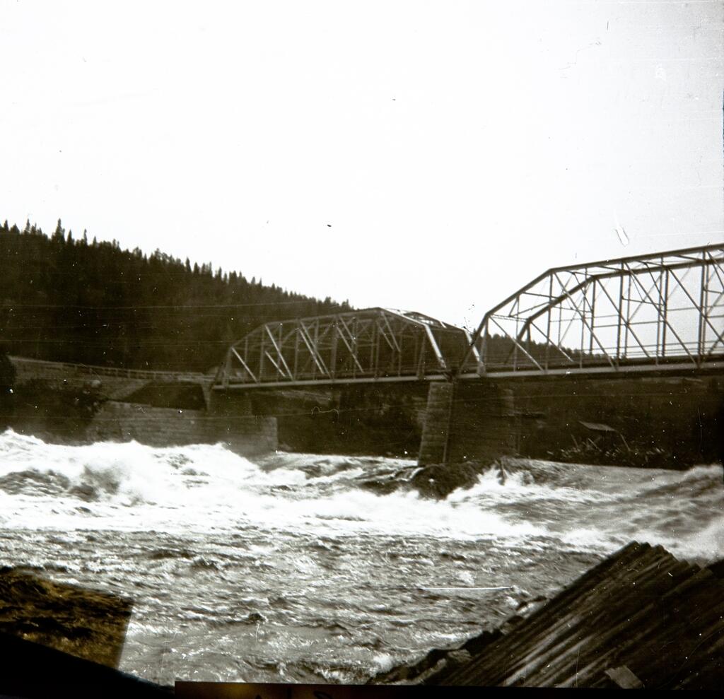 Bron över Ångermanälven vid Nämforsen. Timmerbrädor i förgrunden.