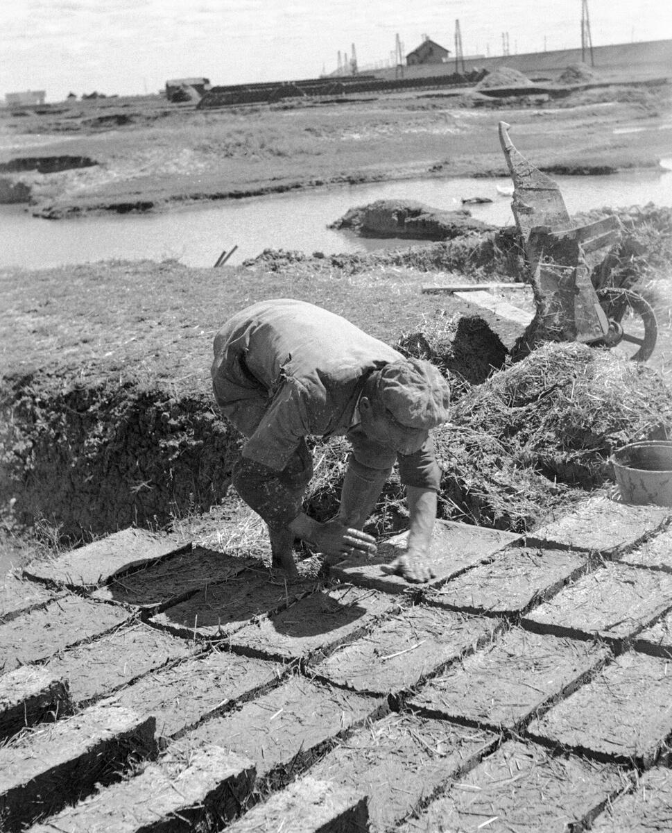 Tillverkning av lertegel. Fyllning av formen. Ungern. Tjeckoslovakien-Ungern-Österrike 1935.