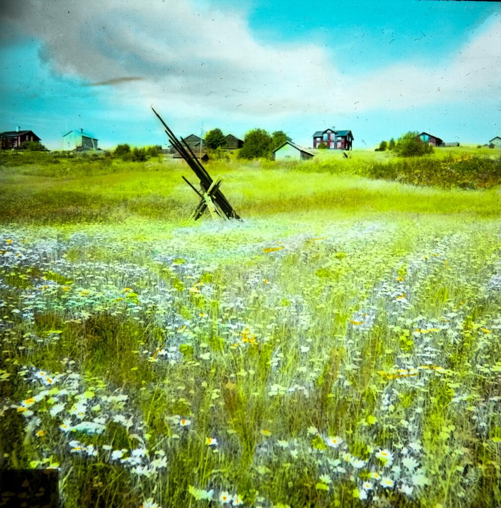 En blomstrande äng med bebyggelsen i bakgrunden.