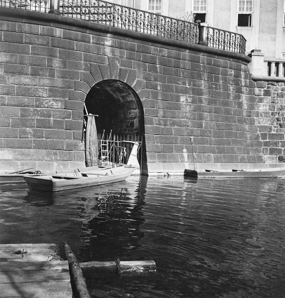 En tunnelmynning på floden Moldaus östra sida. 50°05'13.6\"N 14°24'50.1\"E. Tjeckoslovakien-Ungern-Österrike 1935.