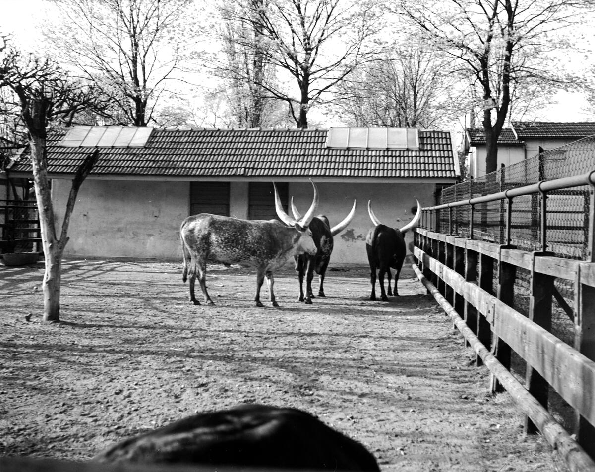 Nötkreatur på Hagenbecks djurpark i Hamburg. Möjligen Watusiboskap? Tyskland-Holland-Belgien 1938.