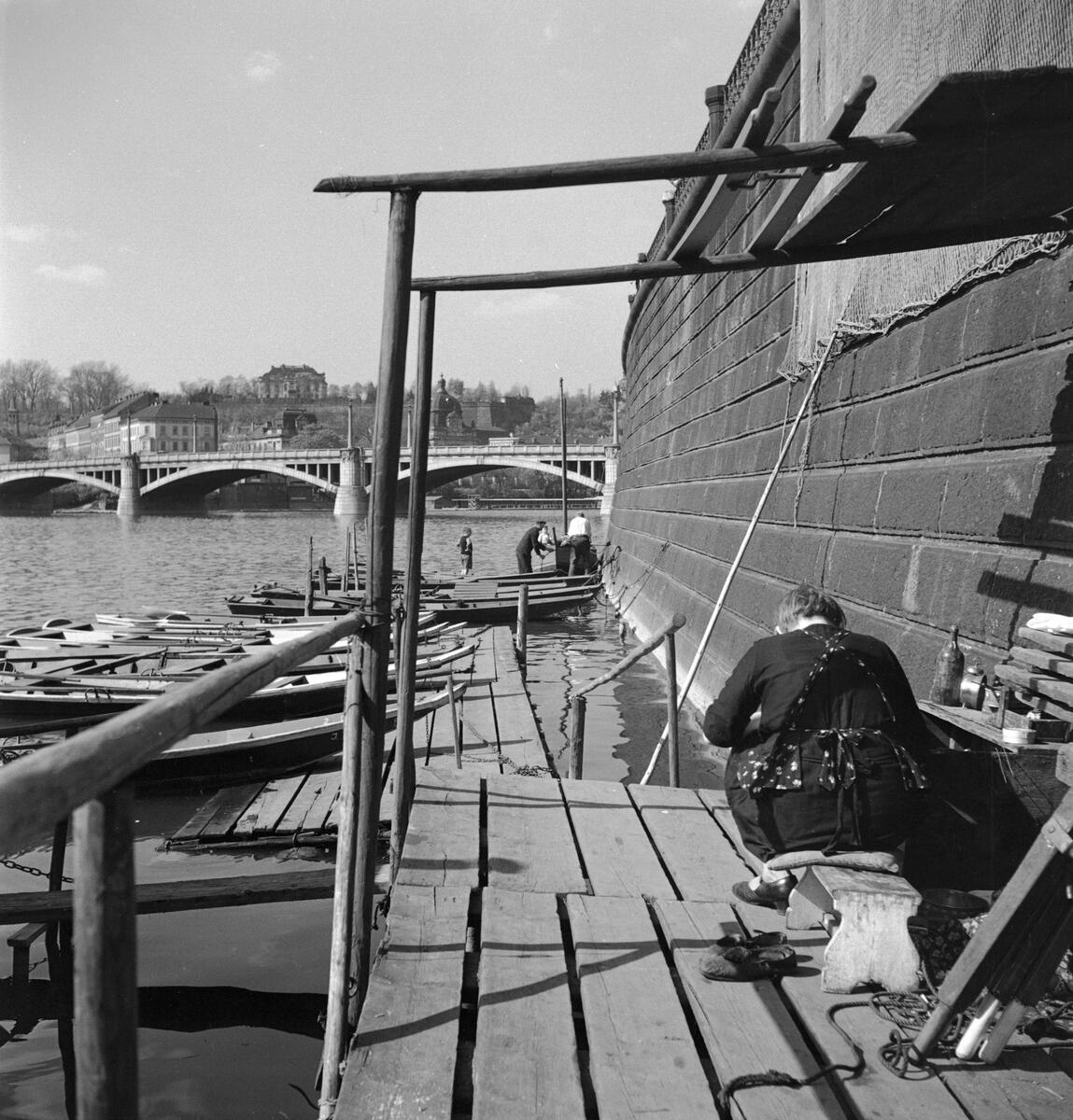 Båtar vid en brygga på floden Moldaus östra sida. I bakgrunden Mánes-bron. Tjeckoslovakien-Ungern-Österrike 1935.
