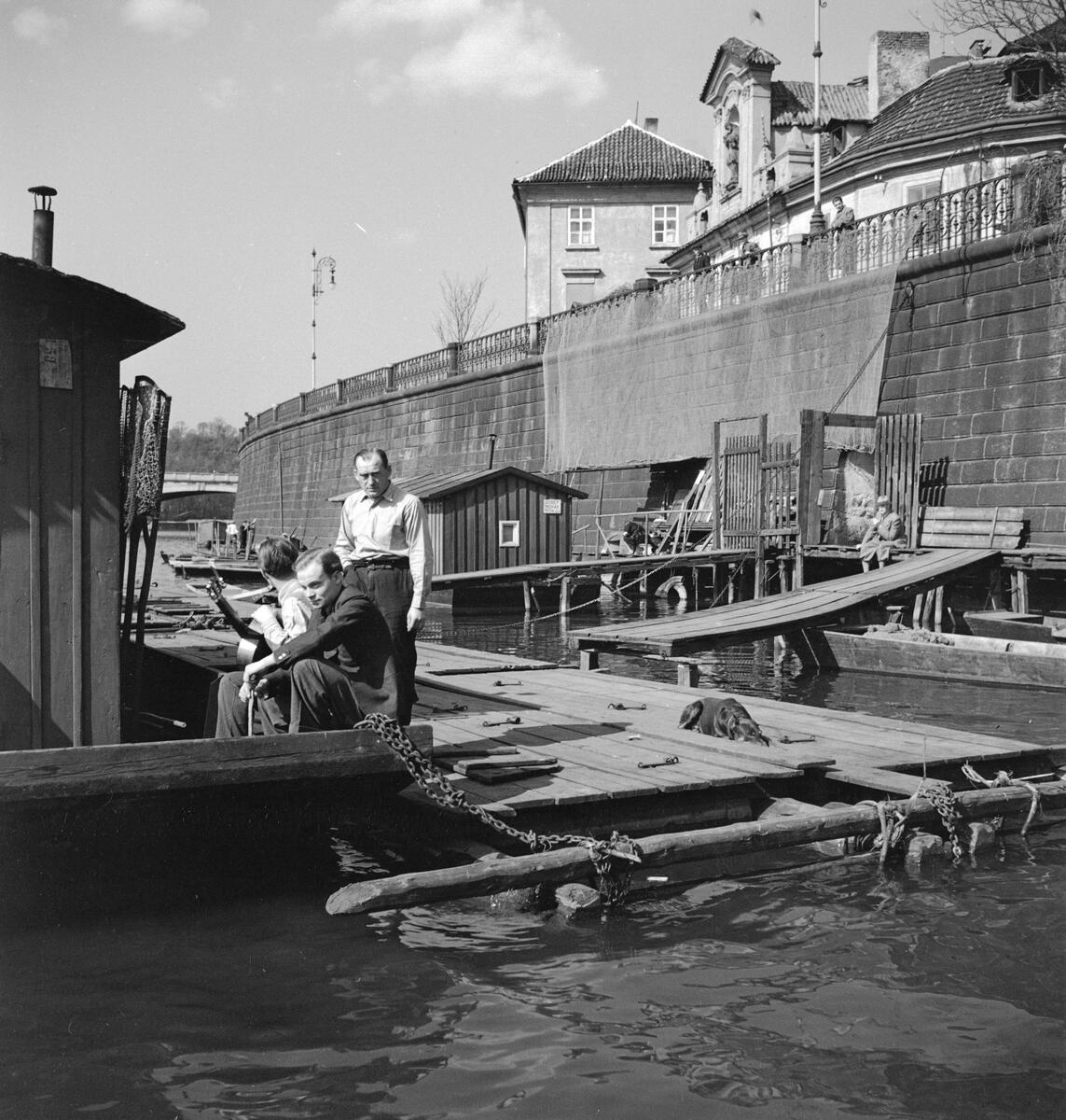 Båtar och pråmar på floden Moldaus östra sida. 50°05'14.7\"N 14°24'49.7\"E. Tjeckoslovakien-Ungern-Österrike 1935.