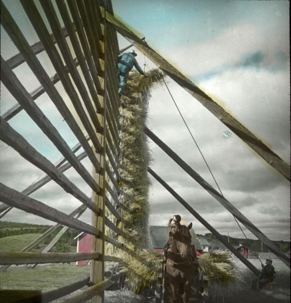 Kornhässja med männsiskor som håller på att hänga kärvar på den innan tröskningen. Vagn med hästen i förgrunden.