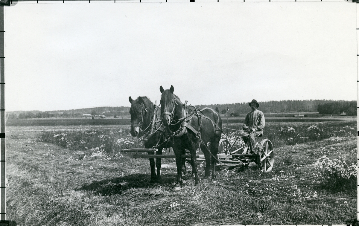 Oskar Pettersson på slåttermaskin, c:a 1915.