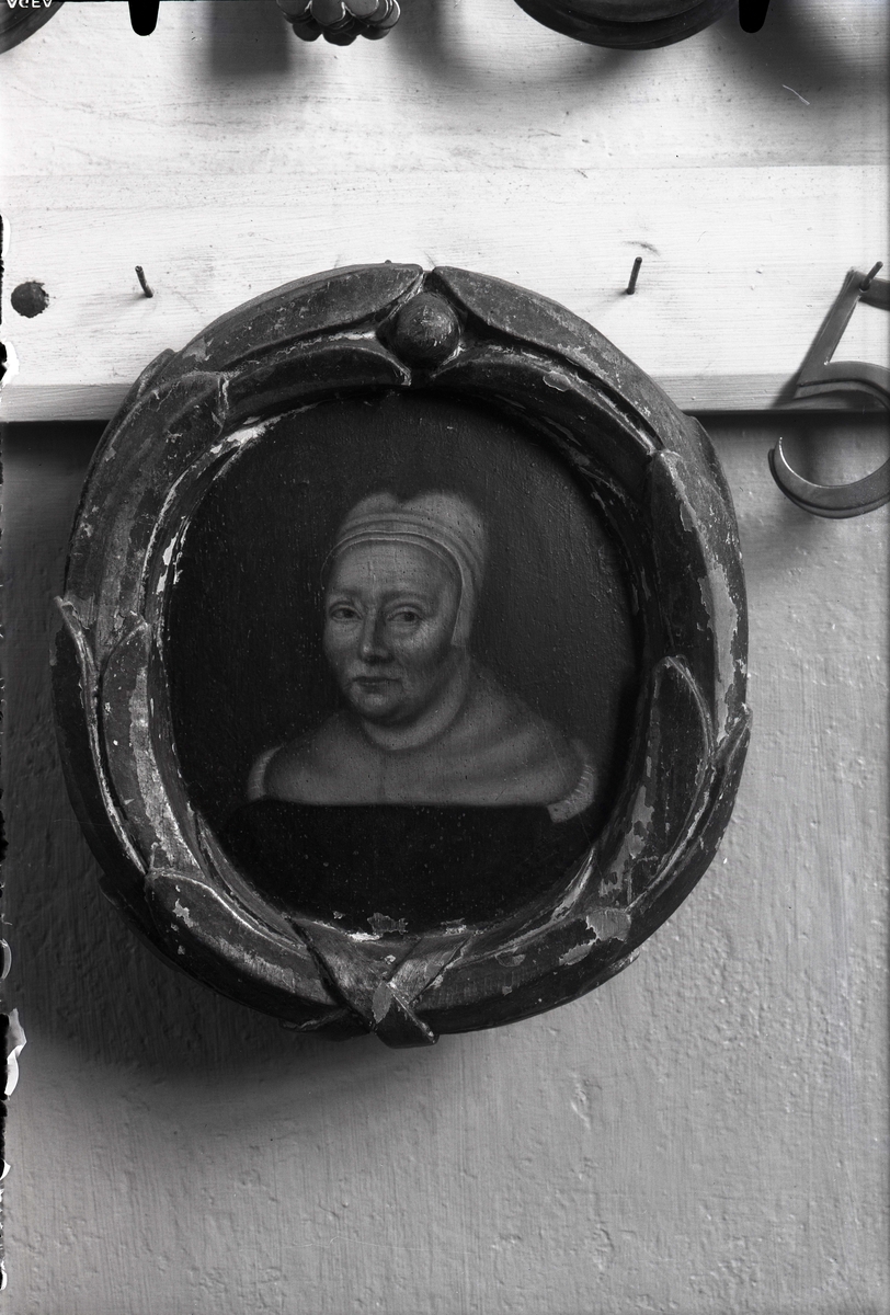 Titel: Målat porträtt av kvinna. Tillhör epitafium i Gunnilbo kyrka, Skinnskatteberg.