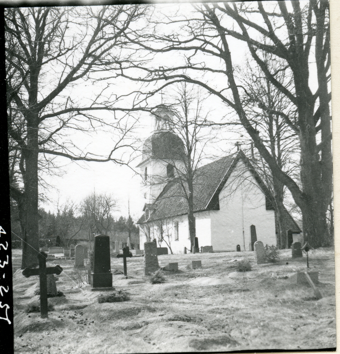 Exteriör av kyrkan och del av kyrkogården, 1946-1947.