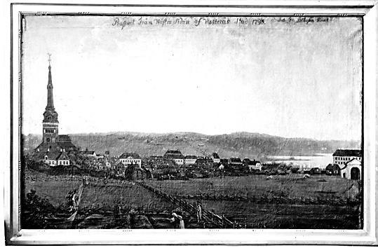 Oljemålning med texten "Prospect från Wästra sidan af Westerås stad 1793".