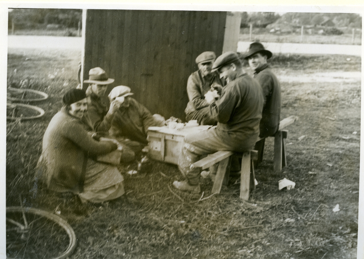 Arbetslaget - en kvinna och fem män - har fikarast.