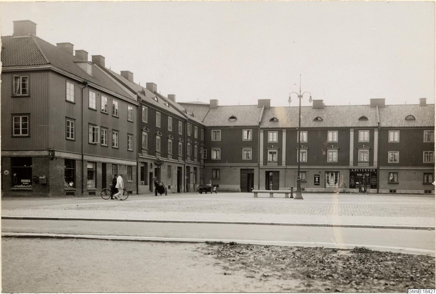 Vy över Holländareplatsen, mot söder. Landshövdingehuskvarter med butiker.