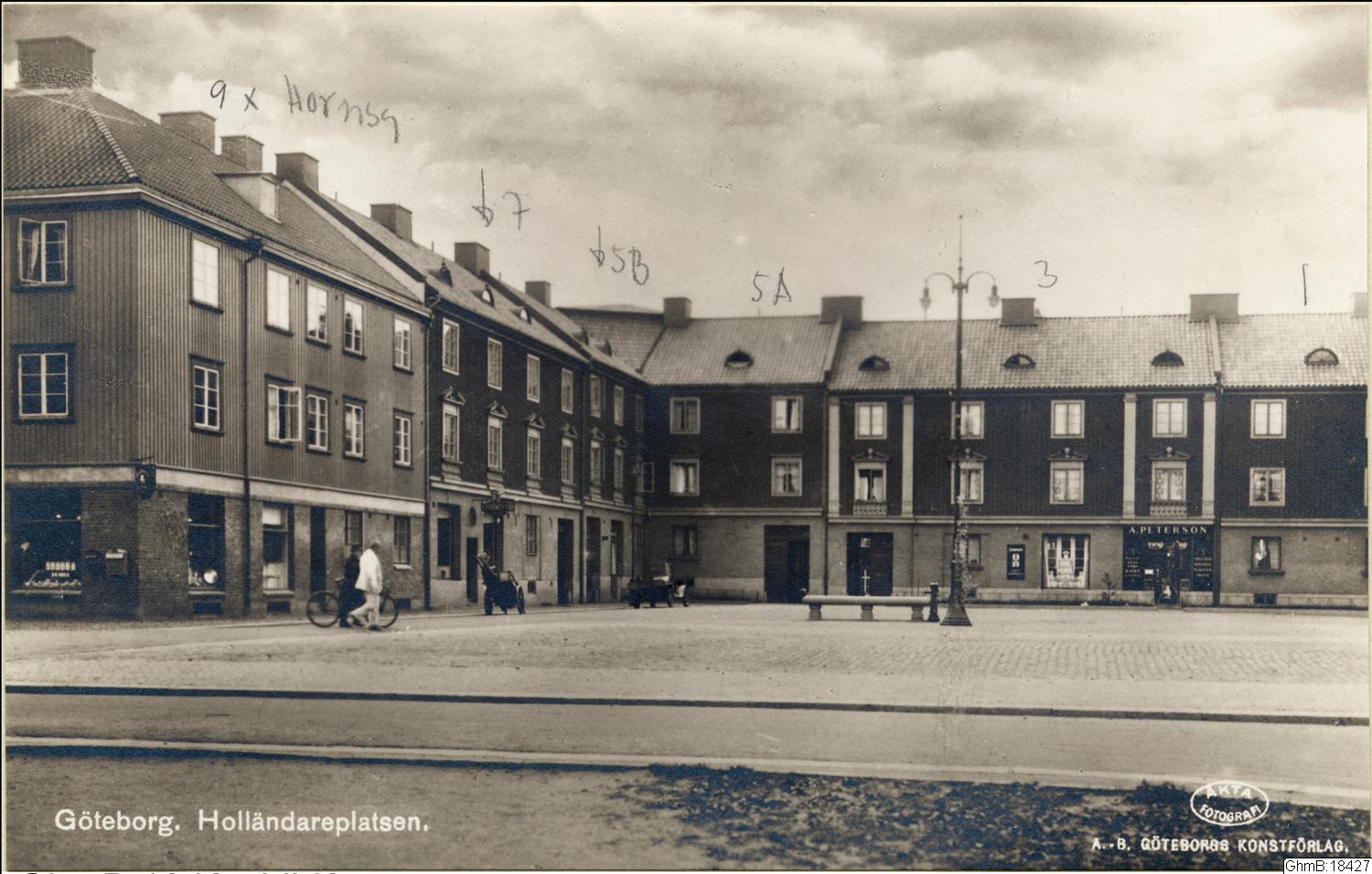Vy över Holländareplatsen, mot söder. Landshövdingehuskvarter med butiker.