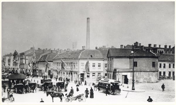 Östra Hamngatan vid vattenreservoaren 1888. (Darrige) Tandläkare Beskoj hyrde i reservoaren. Trekinbyrån låg snett bakom.