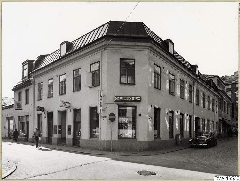 Svartvitt fotografi, föreställande korsningen Magasinsgatan 15/Vallgatan 5. Fotografiet taget i mars 1973.