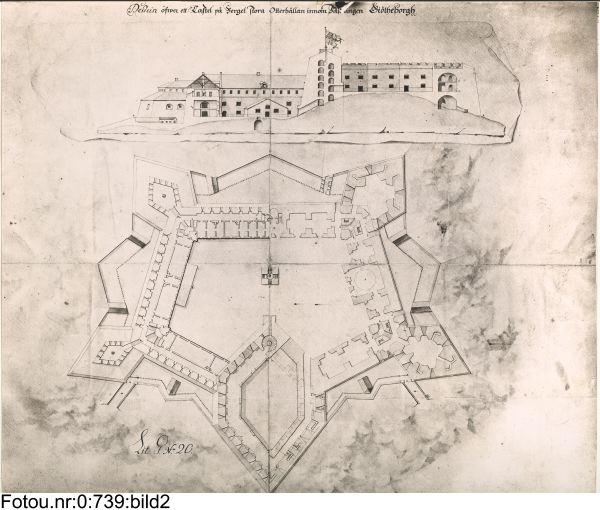 Beskrivning: plan, fasad och profil till ett kastell på Stora Otterhällan.