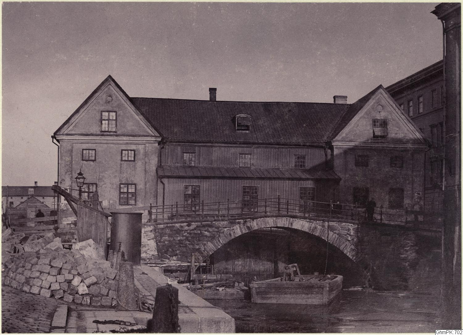 Västra sida av Slusskvarnen byggd 1648. Fotografi kort före dess rivning 1873.