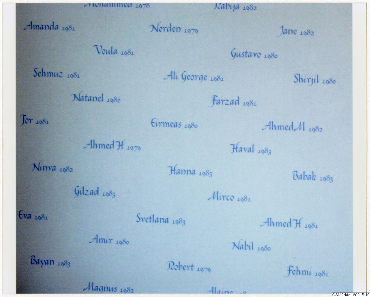 Del av skärmvägg med namn på de omkomna. Finns i minneslokalen Backaplan.