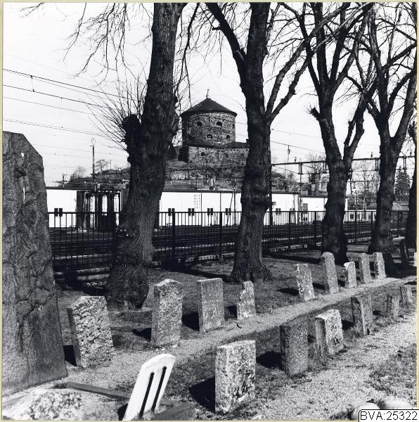 Svartvitt foto med Judiska begravningsplatsen. Skansen Lejonet i fonden