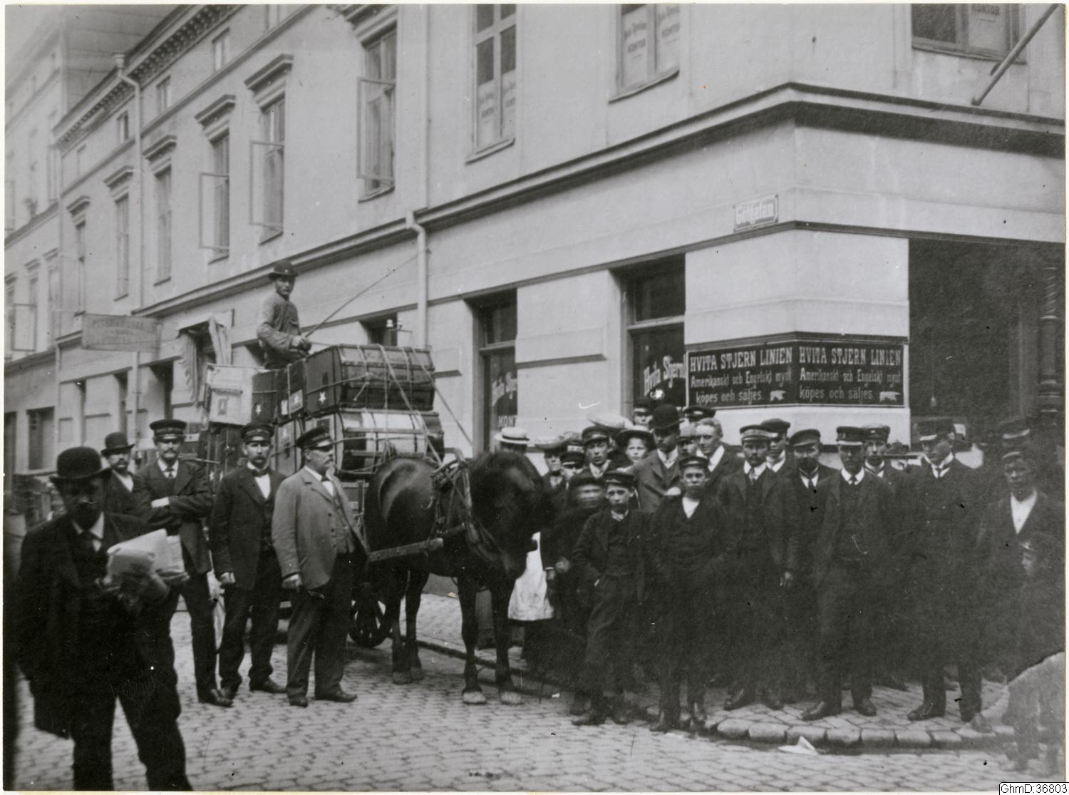 Hörnet Götgatan 8 och Postgatan 34 med Hvita stjernlinjens kontor. Hvita Sternlinjen var ett av de stora rederierna med emigranttrafik Vagnen med koffertar på till hamen för att lastas för amerikaresan.