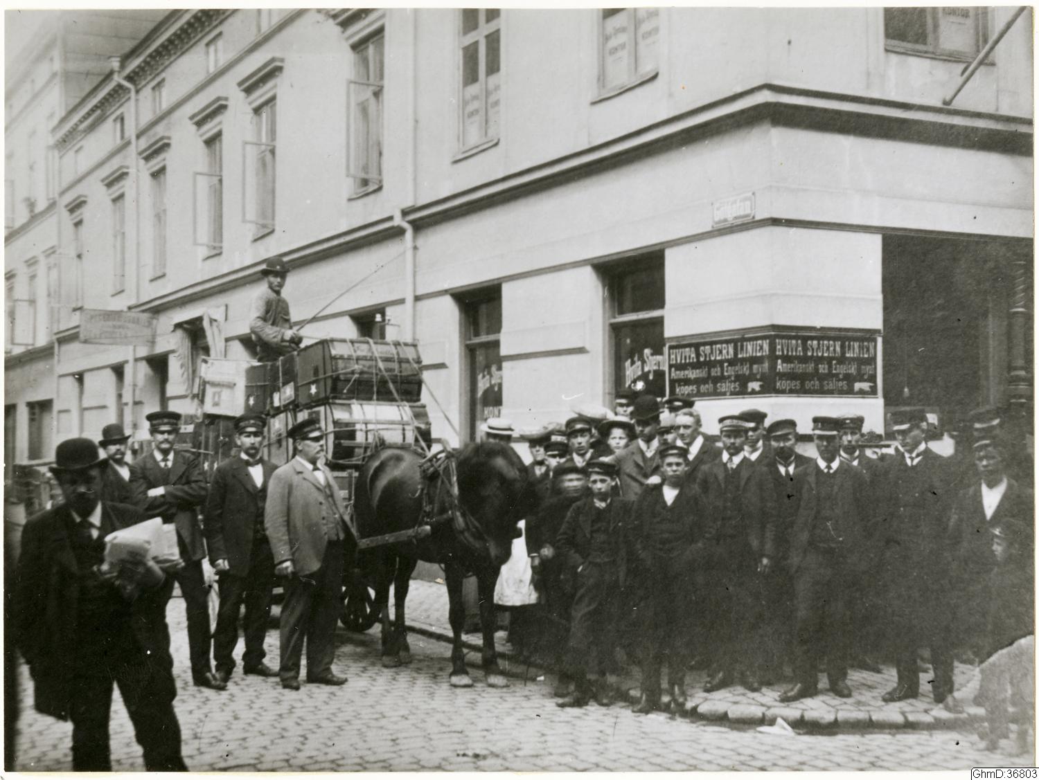 Hörnet Götgatan 8 och Postgatan 34 med Hvita stjernlinjens kontor. Hvita Sternlinjen var ett av de stora rederierna med emigranttrafik Vagnen med koffertar på till hamen för att lastas för amerikaresan.
