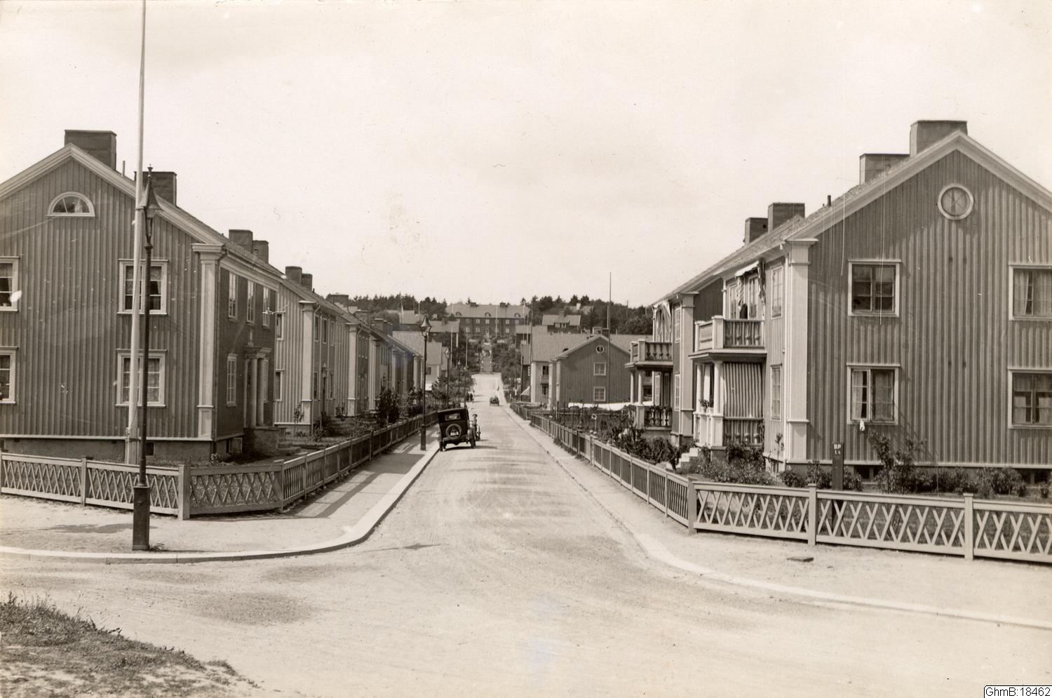 Klintens Väg från korsningen Sundhagsgatan västerut, Kungsladugård egnahemsområde. I fonden Klintens trappor.