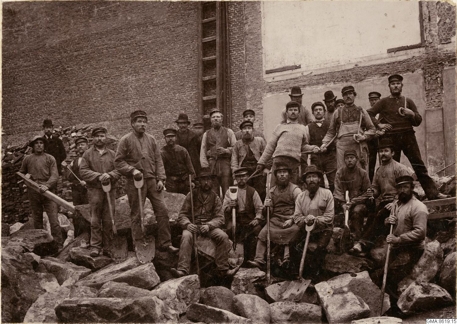25 st byggnadsarbetare på en okänd arbetsplats, gissningsvis centrala Göteborg. Repet används för att dra undan sten med handkraft.