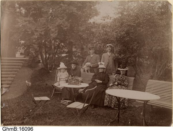 Beskrivning: Medlemmar av familjen Kennedy, gruppbild tagen i trädgården till Villa Rosenborg på Arendal. Douglas Kennedy förvärvade sommarhuset från Erik Sahlén. Villan var en ombyggnation av en äldre bondgård.