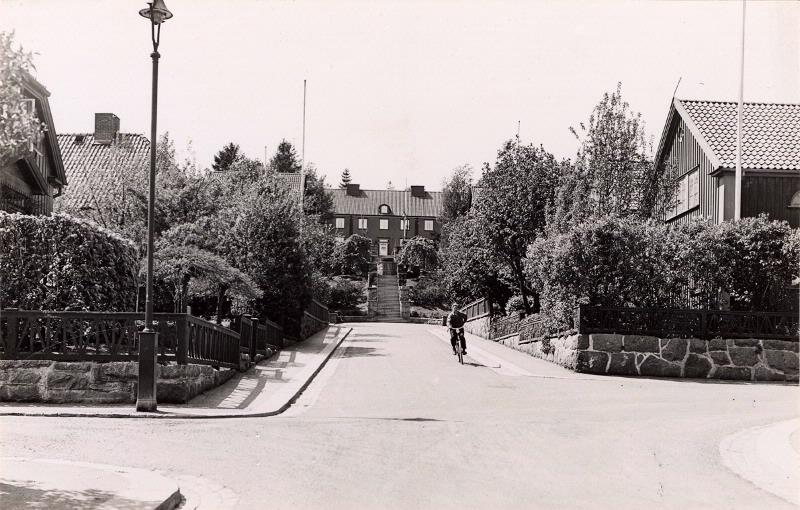 Egnahemsområdet i Kungsladugård vid Klintens Väg. Blick från korsningen Oxhagsgatan västerut mot Klintens trappor och Svalebogatan.