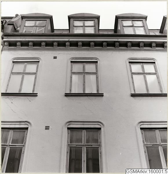 Fasaden till Drottninggatan 56. Trevånings stenhus med ljus puts.