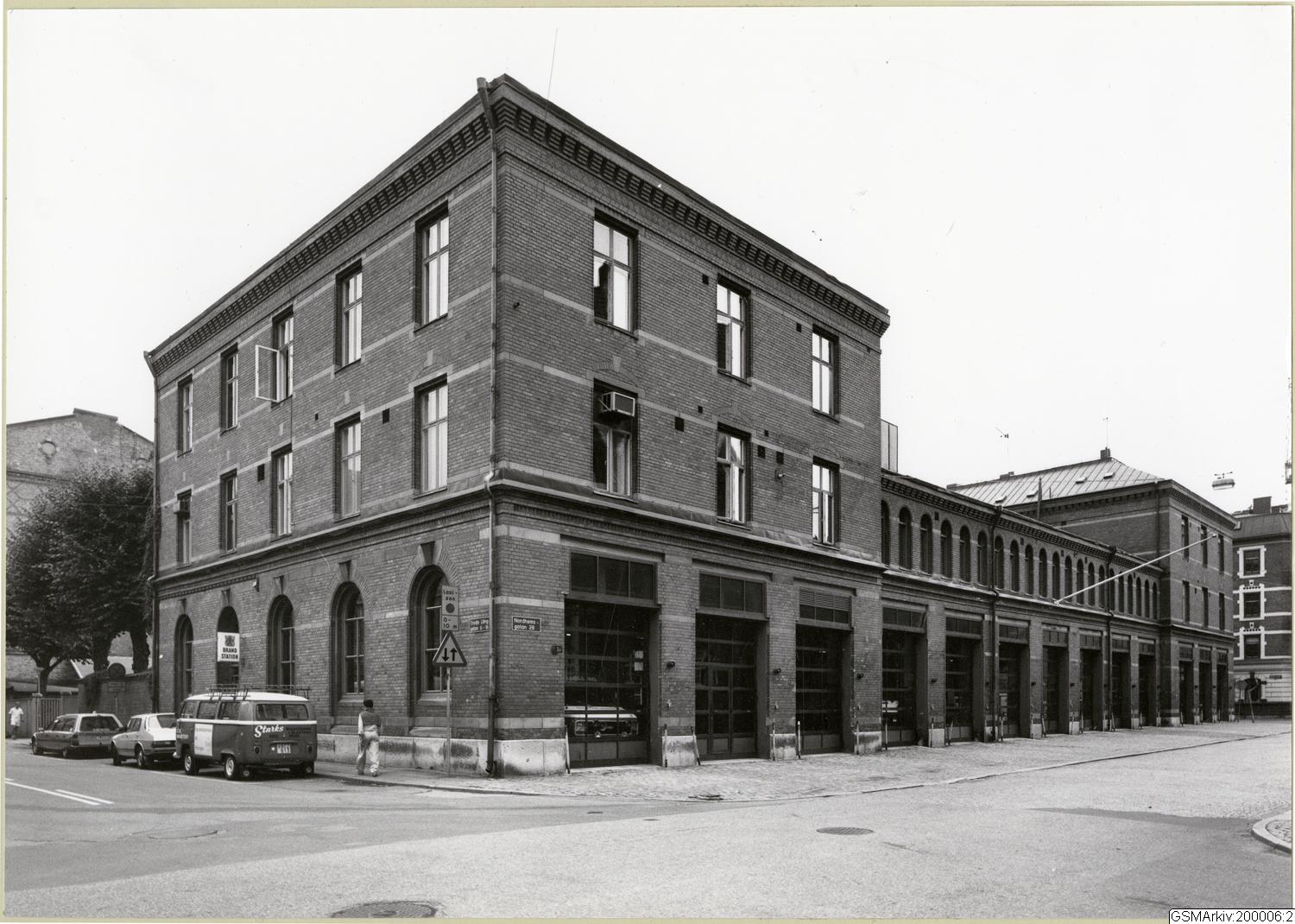 Brandstationen vid Tredje Långgatan/Nordhemsgatan. Längs Nordhemsgatan 13 portar för utryckningsfordon.