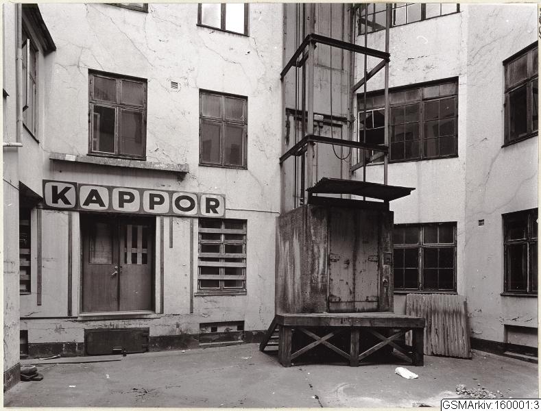 Gårdsinteriör med hiss utanpå huset. Lastintag till kappaffär.