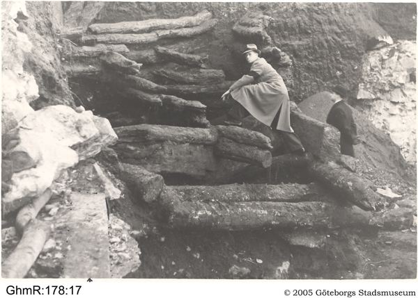 Beskrivning: Stockverket från S. T. v. i förgrunden cementlist, rest av en kägelbana.