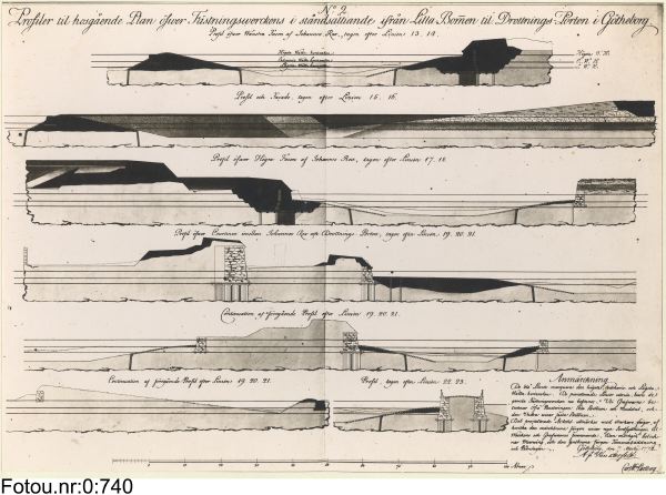 Beskrivning: profiler till fästningsverken emellan Lilla Bommen och Drottningporten, upprättade för verkens inståndsättande av löjtnanten vid Fortifikationen Carl Wilhelm CarlBerg år 1774.