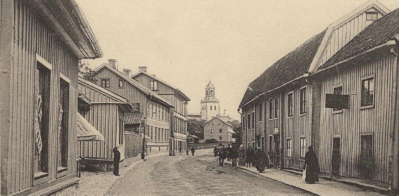 Sträckningsbild på Karl Johansgatan mot öster från Kusttorget. Karl Johanskyrkans torn i bakgrunden.