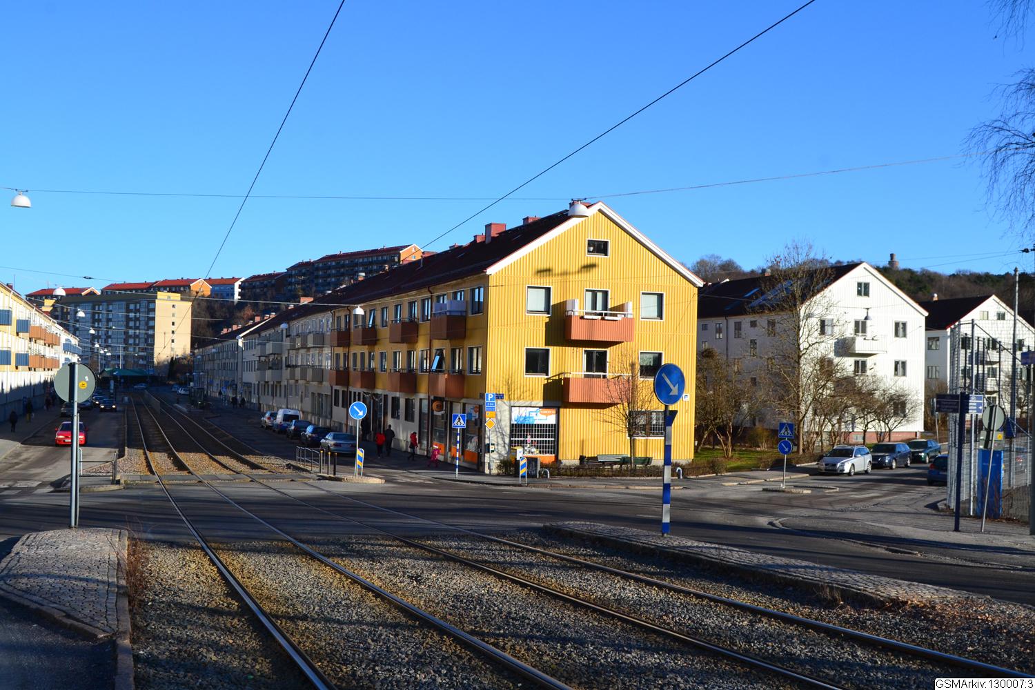 Sträckningsbild med Ekedalsgatan mot Bangatan och Masthugget i fonden. Till höger Hålekärrsgatan.