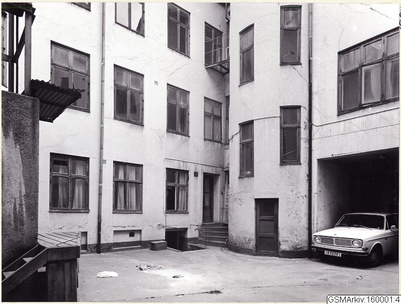 Gårdsinteriör med hiss utanpå huset, syns till vänster, till höger portgång.